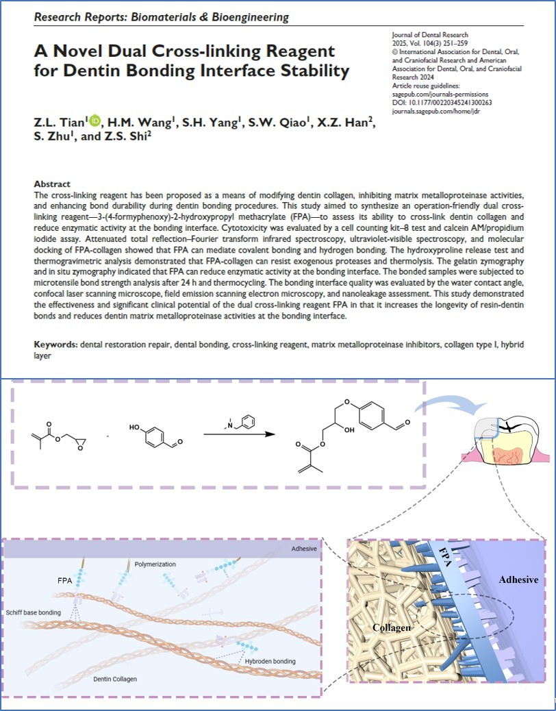 近日,我院口腔修复科朱松教授团队和吉林大学超分子结构与材料国家重点实验室崔占臣教授、史作森副教授的科研团队合作,自主设计合成了一种能与牙本质胶原发生双重交联的3-(4-甲氧基)-2羟基丙烯酸酯(FPA)单体,并且在此基础上构建了新型聚氨酯牙本质粘体系。相关成果以题目“A Novel Dual Cross-linking Reagent for Dentin Bonding Interface Stability”发表于口腔医学国际顶级刊物《Journal of Dental Research》。