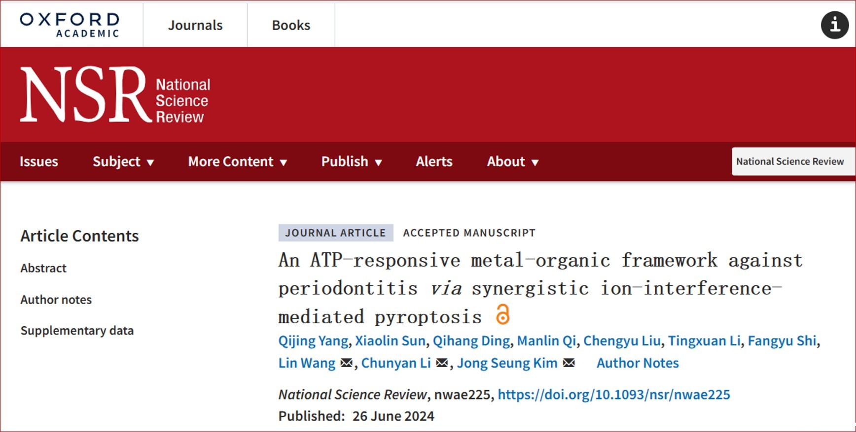 近日,我院口腔修复科李春艳主任医师与韩国高丽大学Jong Seung Kim教授合作,开发了一种ATP响应的双金属有机框架(Mg/Zn-MOF)。相关成果以题目“An ATP-Responsive Metal-Organic Framework against Periodontitis via Synergistic Ion-Interference-Mediated Pyroptosis”发表于《National Science Review》上。